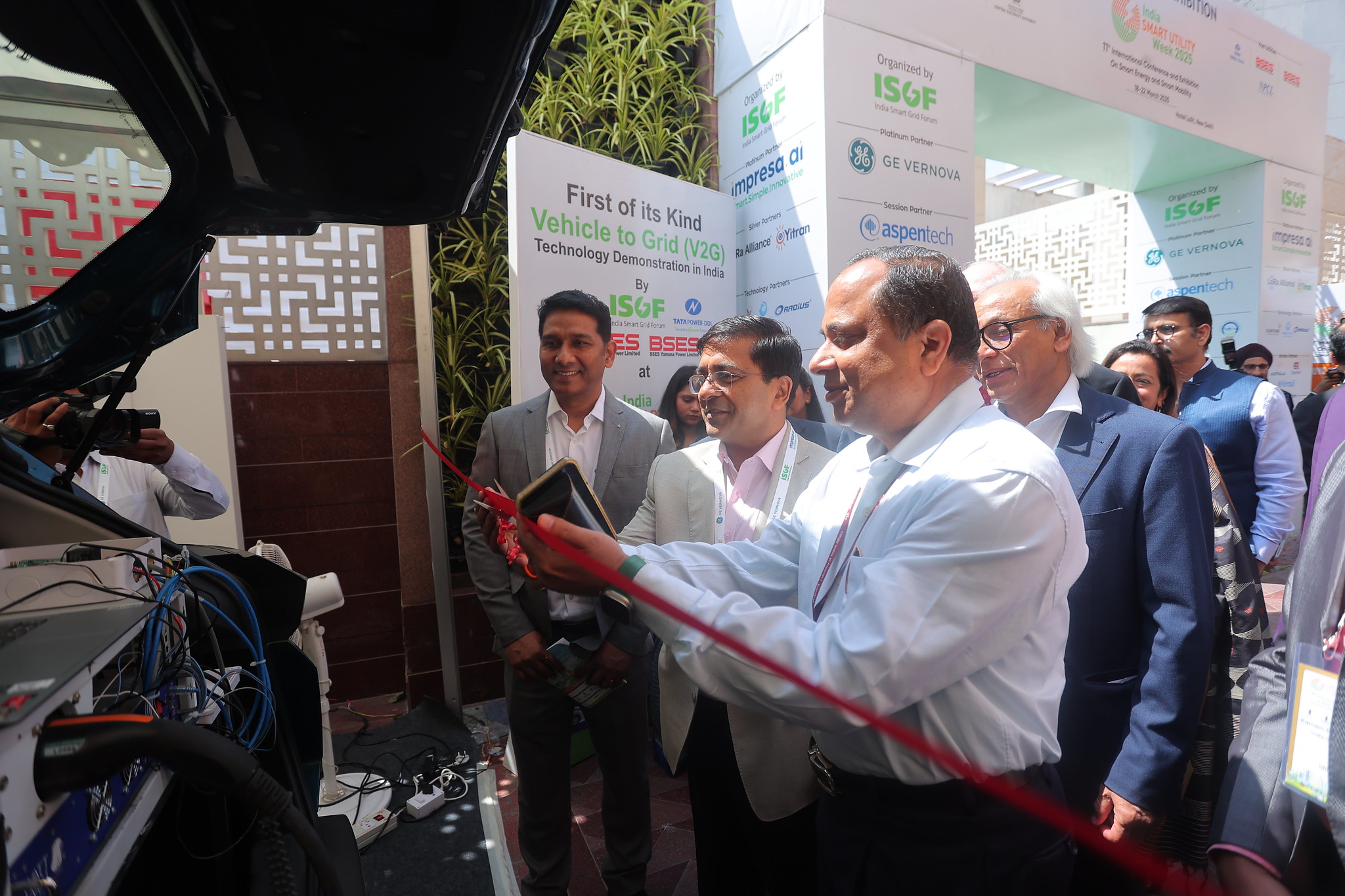 Shri Ghanshyam Prasad Ji and Shri Ashish Kumar Goel Ji inaugurating South Asia’s first-ever Vehicle-to-Grid (V2G) technology demonstration project at ISUW 2025